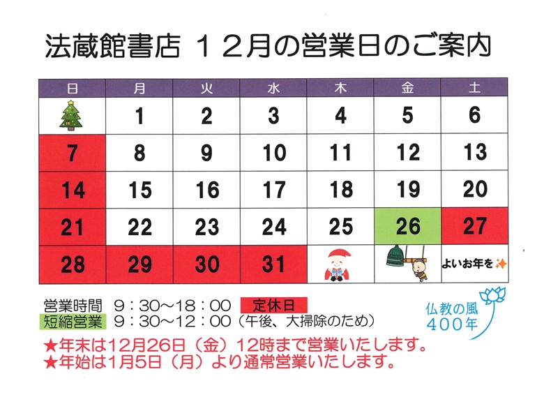法藏館書店 12月の営業日
